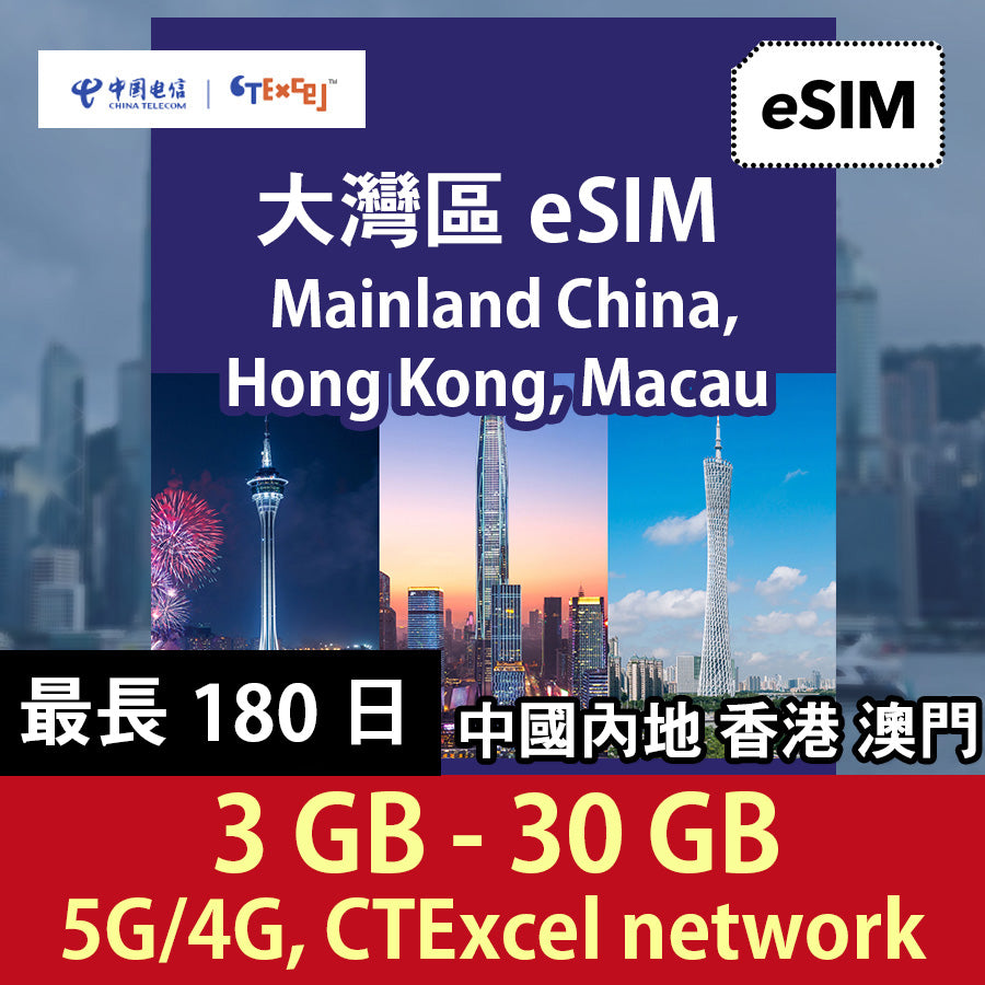 [China, Hong Kong and Macau eSIM] 3-30GB high-speed traffic + unlimited data for up to 180 days (China Telecom Hong Kong CTExcel)