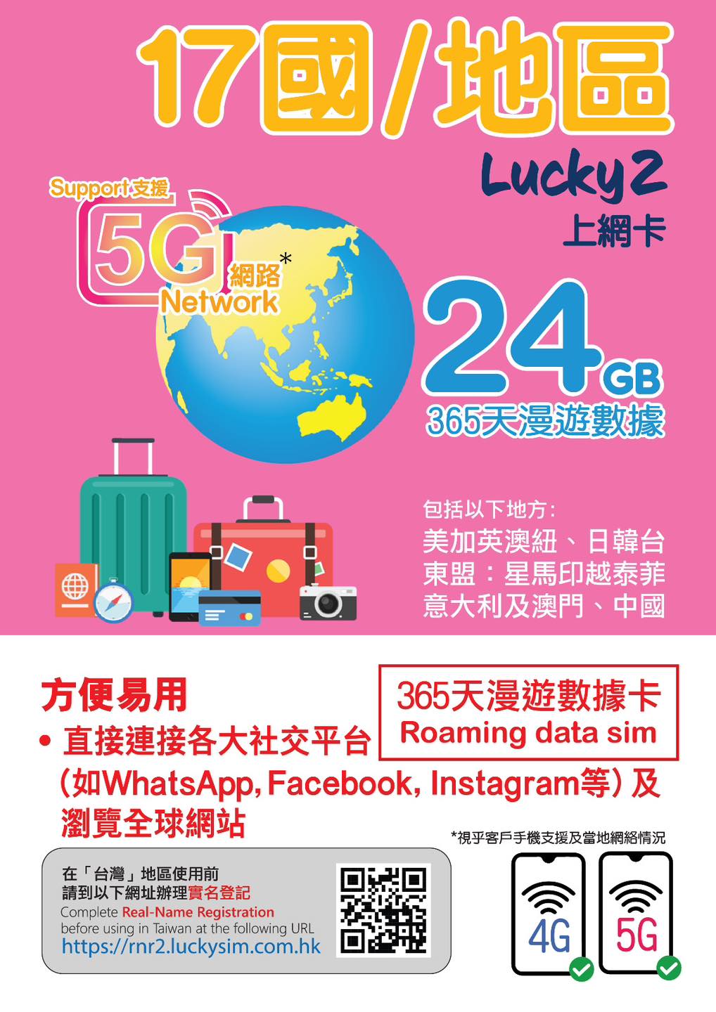 【Lucky2 eSIM】17 countries/regions 365 days 24GB 5G/4G travel data card