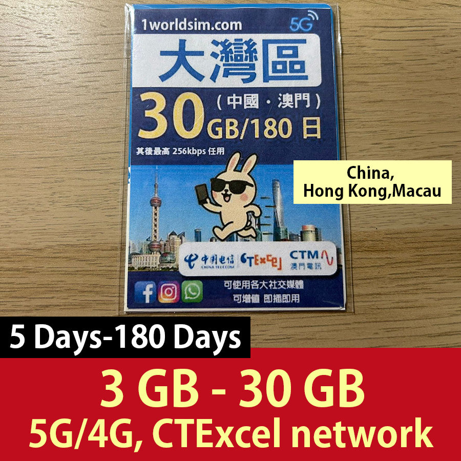 【中港澳實體SIM】3-30GB高速流量+無限數據 最長180日 (中國電信香港 CTExcel)