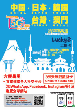Lucky2 中國、日本、韓國、台灣、澳門 5地365日30GB 其後降速512K無限上網+送5GB香港數據 實體Sim卡 旅遊數據卡
