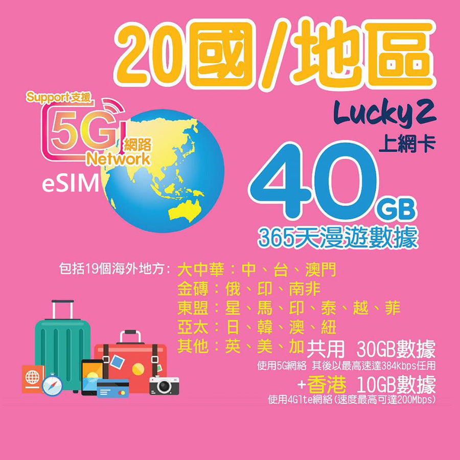 【Lucky2 eSIM】20國/地區 365日30GB + 香港10GB數據卡 Sim卡旅遊數據卡