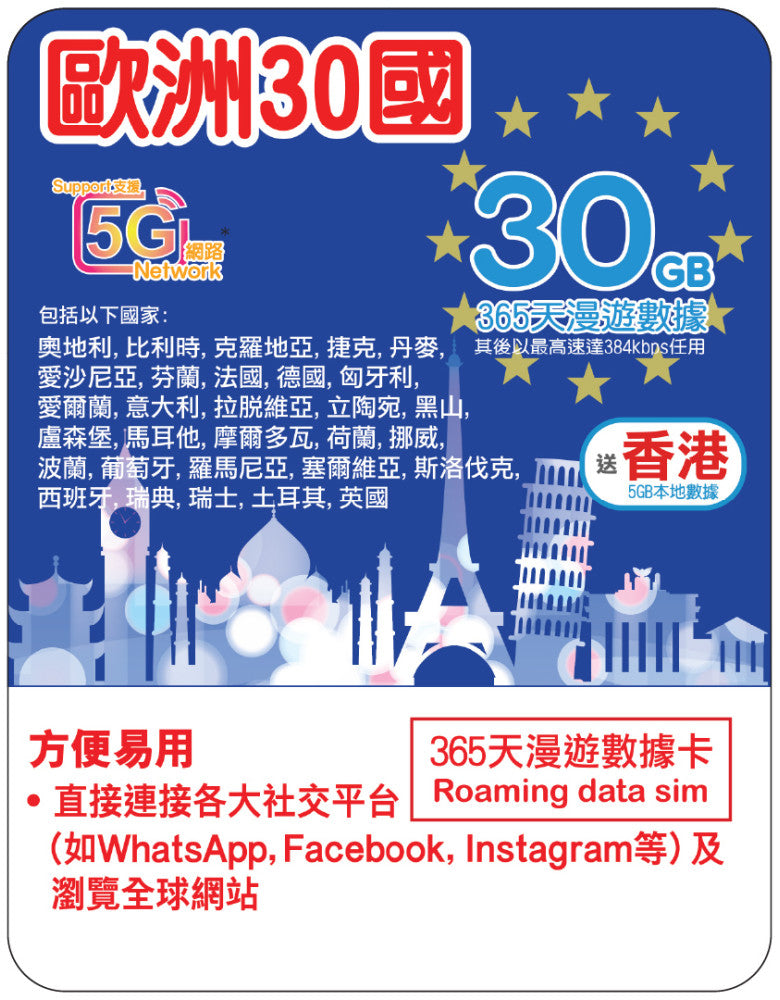 【Lucky2 eSIM】歐洲30國家 365日 頭30GB其後384Kbps無限數據 + 香港5GB 旅遊數據卡