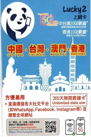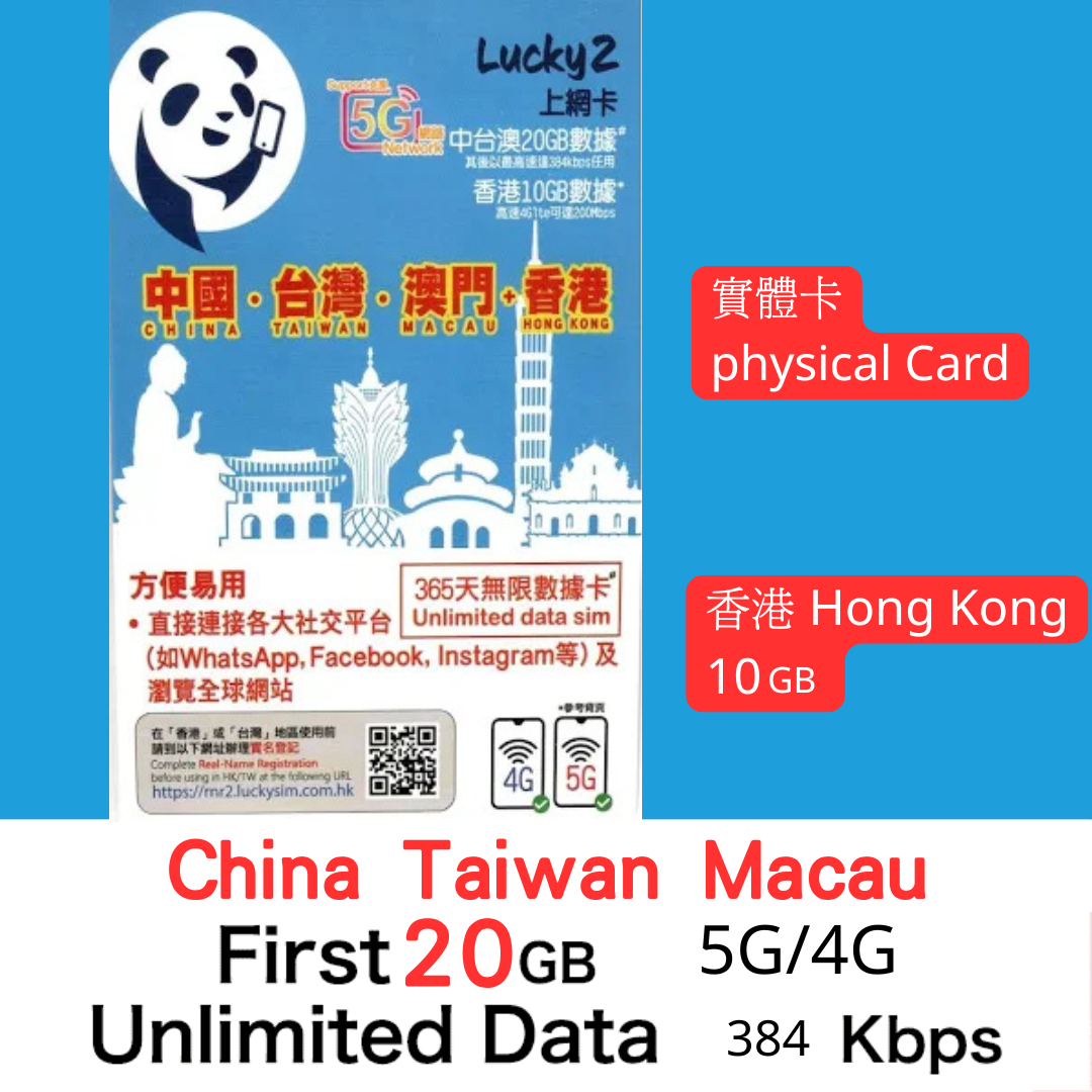 【Lucky2實體SIM】Lucky 2 中台澳 20GB無限數據+香港10GB 旅遊數據卡