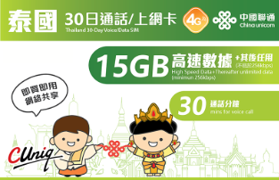 【聯通eSIM】泰國30日 15GB 帶30分鐘可接聽/致電泰國電話 通話流量卡