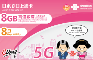 【聯通eSIM】日本8天8GB上網卡 其後降速512kbps無限流量 5G上網卡