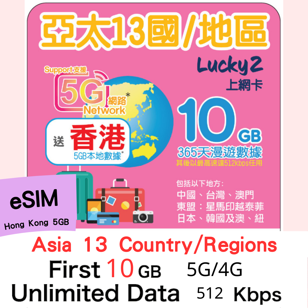 【Lucky2 eSIM】亞太13國/地區 365日 頭10GB其後512Kbps無限數據 免費送5GB香港本地數據!Sim卡旅遊數據卡
